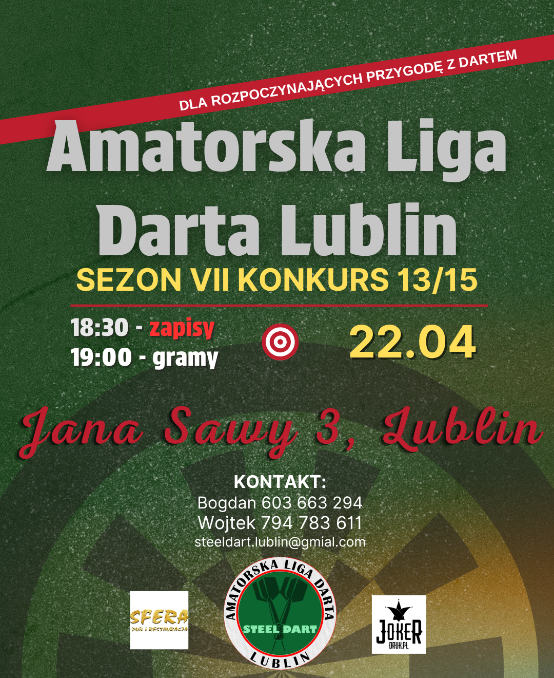 Zapraszamy do pubu Sfera przy ul. Jana Sawy 3 w Lublinie na kolejny, 13. 🎯 konkurs VI Sezonu naszych rozgrywek. Zachęcamy do nich, mimo daty 😊, wszystkich chętnych i chcących poznać grę w lotki. Szczególnie ciepło witamy osoby dla których spędzanie czasu wolnego w dobrym towarzystwie jest ważne a adrenalina współzawodnictwa jest ciekawym uzupełnieniem wieczoru...